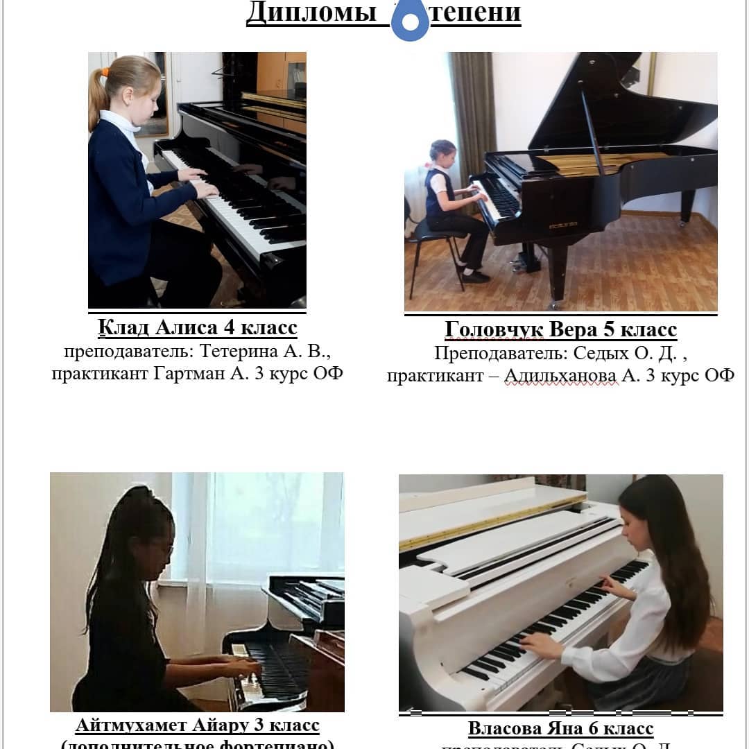 Фортепиано бөлімінде техникалық сынақты өткізудің дәстүрлі түрі «Жас виртуоз» байқауы болды, барлық жеңімпаздар мен қатысушыларды құттықтаймыз және педагогтарға дайындықтары, өткізулері және марапаттаулары үшін үлкен алғысымызды білдіреміз.