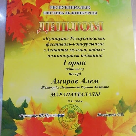 Алматы қаласында өткен Республикалық конкурс фестивалінің аспаптық музыка Кобыз номинация бойынша Амиров Алем 1 орын иегері атанды .жетекші: Нагишпаева Раушан Аблаевна. Құттықтаймыз