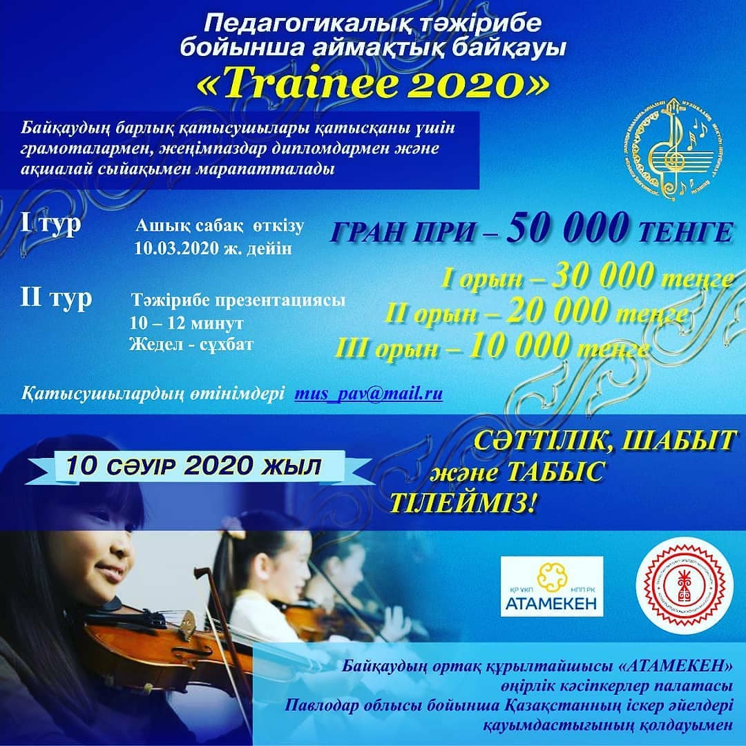 Үшінші жыл біздің колледжде Павлодар облысы бойынша Қазақстанның іскер әйелдер қауымдастығы мен «Атамекен» өңірлік кәсіпкерлер палатасының қолдауымен педагогикалық тәжірибе, жыл тәжірибеден өтуші бойынша конкурс табысты өткізіліп келеді. Биылғы жылы конкурс өңірлік, Trainee 2020 мәртебесіне ие болды, Музыкалық білім беру мамандықтары бар колледждерге шақырылды және қатысуға дайындалуда.Чайковский атындағы Алматы музыкалық колледждерінің қатысушыларын күтеміз.